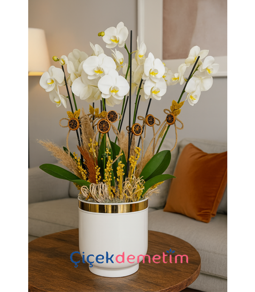 Çiçek Demetim, orkide aranjmanlarını özenle hazırlayıp aynı gün teslim eder. Beyaz orkidelerin zarif güzelliğini, kuru çiçeklerin doğal tonlarıyla birleştiren bu tasarım; sevdiklerinize unutulmaz bir hediye olacaktır.