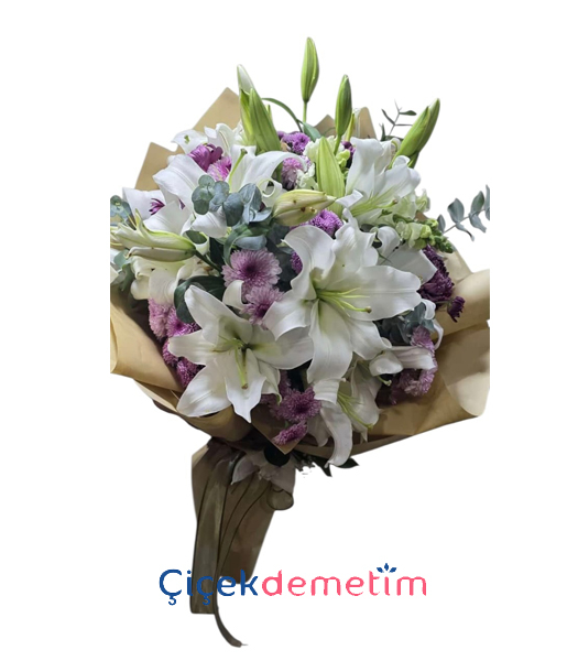 arafeti ihtişamla birleştirdik. Geniş açmış, yoğun kokulu beyaz lilyumlar ve özel üretim lila güllerin usta ellerde hayat bulduğu bu devasa buket, en özel anlarınızın şahidi olacak. Şık kadife kağıtlar ve ipek kurdelelerle tamamlanan bu tasarım, kaliteden ödün vermeyenler için hazırlandı.