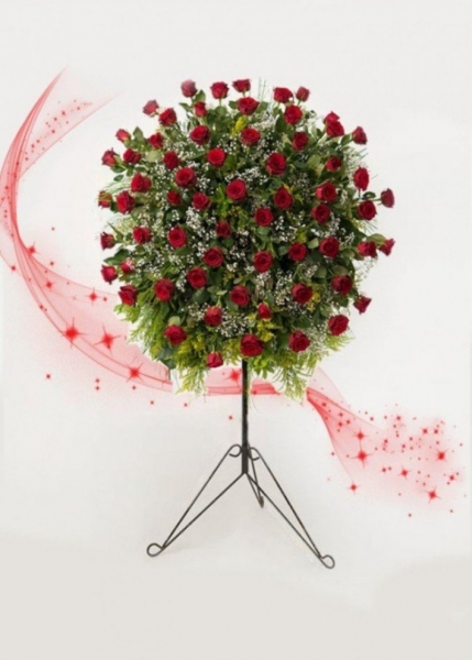 Kırmızı gülün tartışmasız asaleti, ferforje ayaklı tasarımın heybetiyle buluştu! Bu özel çalışma, hem kurumsal açılışlarda prestijli bir duruş sergilemek hem de evlilik yıl dönümü gibi en özel anlarda unutulmaz bir sürpriz yapmak için özenle hazırlandı.