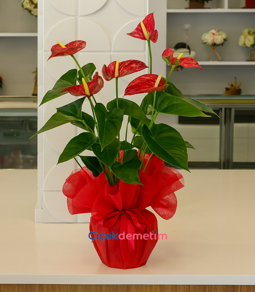 Çiçekdemetim.com ayrıcalığıyla özenle hazırlanan Antoryum bitkisi, uzun ömürlü yapısıyla sadece bir gün değil, uzun süre boyunca sevginizi hatırlatır. Yeni iş kutlaması, doğum günü, ev hediyesi ya da özel günler için mükemmel bir tercihtir.