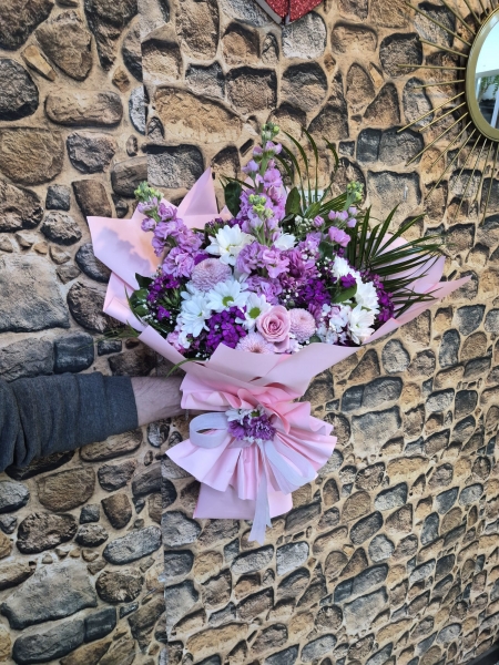 Pastel tonların dinginliğini, ithal çiçeklerin asaletiyle buluşturan bu butik tasarım, sıradan bir çiçekten çok daha fazlasını sunuyor. Yumuşak geçişli pembe ve lilanın uyumu, egzotik dokunuşlarla birleşerek her bakışta yeni bir detay keşfettiriyor.