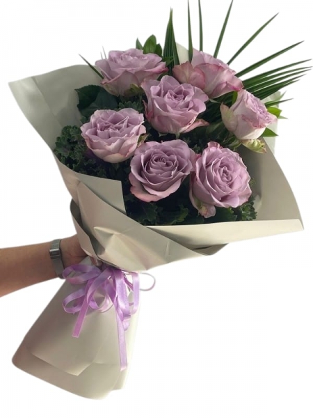 Çiçek İçeriği: Birinci sınıf ithal lila güller, pudra tonlarında yardımcı çiçekler ve okaliptüs dalları.Tasarım Notu: Renk geçişlerinde bütünlüğü korumak adına özel dokulu kağıt ve saten kurdele kullanılmıştır.Gönderim Amacı: Yeni iş tebriki, romantik bir jest veya sadece "sen özelsin" demek için.