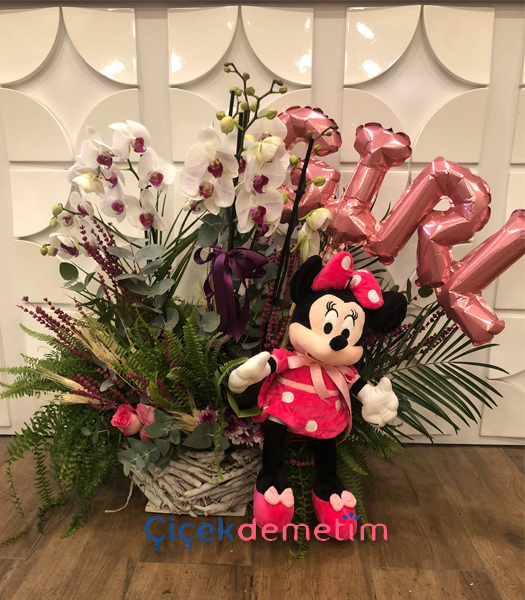 Yeni doğan kız bebek kutlamalarına özel hazırlanan Minnie Mouse temalı orkide aranjmanı, zarafetiyle dikkat çeken beyaz orkideler, pembe güller ve doğal yeşilliklerle tasarlandı. Şık sepet formundaki düzenlemesi, üzerine eklenen pembe “GIRL” balon detayları ve sevimli Minnie Mouse peluş oyuncak ile hem modern hem de duygusal bir hediye seçeneği sunar.
