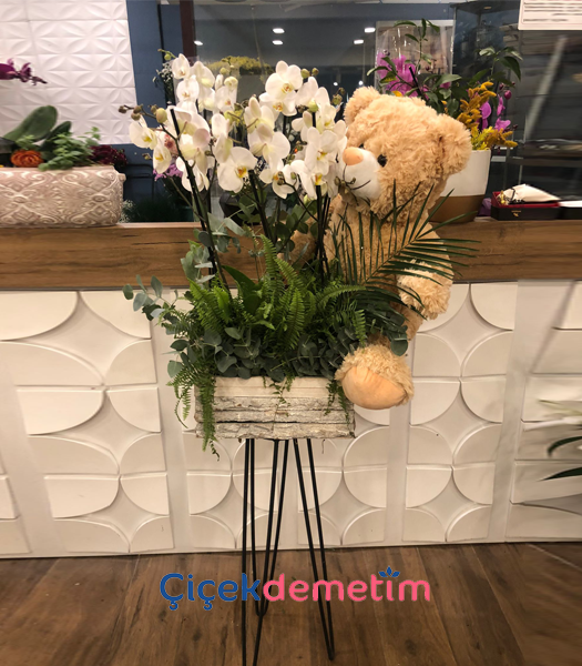 Sevgi dolu, zarif ve sıcacık bir hediye arıyorsanız, bu Orkide ve Peluş Ayıcık Aranjmanı tam size göre! Beyaz orkidenin saflığını ve zarafetini, peluş ayıcığın sevimliliğiyle buluşturan bu özel tasarım; hem romantik hem de neşeli bir atmosfer yaratıyor. Doğal yeşil bitkilerle süslenmiş bu aranjman, şık ayaklı saksısı ile ev ve ofis dekorasyonuna da modern bir dokunuş katıyor. Sevdiklerinize mutluluk, samimiyet ve zarafet dolu bir sürpriz yapmak için mükemmel bir seçim.