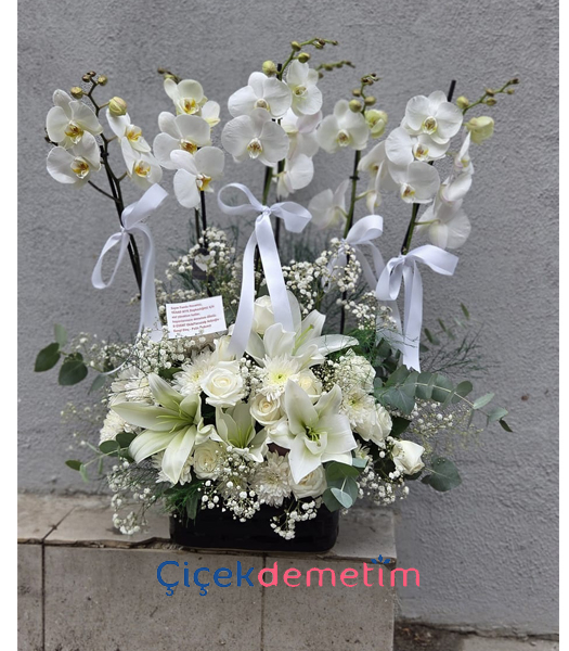 En seçkin beyaz çiçeklerin bir araya geldiği bu özel set, yüksek kalite standartlarında hazırlanmıştır. 5 gövdeli orkidenin kalıcılığı ile taze lilyum ve güllerin anlık etkisi birleşerek unutulmaz bir hediye deneyimi sunar.